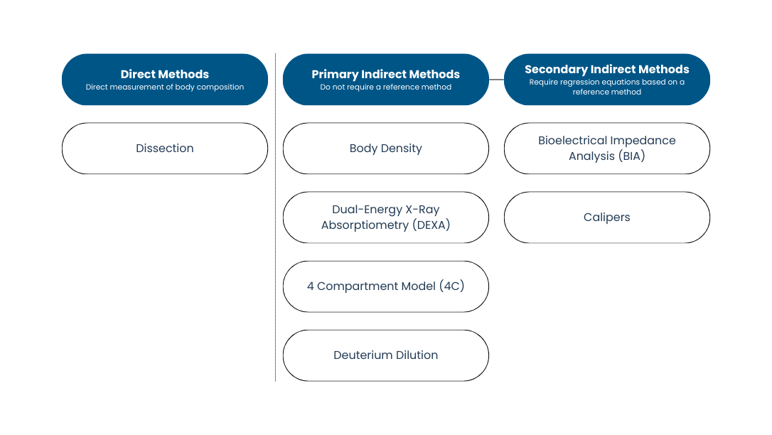 Body composition can be assessed by direct or indirect methods. Direct evaluation requires dissection, and therefore is impractical for living subjects. Consequently, body composition in humans must be estimated by indirect approaches. Indirect methods can be further subdivided into primary indirect methods—derived from theoretical models without reliance on reference equations—and secondary indirect methods, which depend on regression models built from primary techniques.
