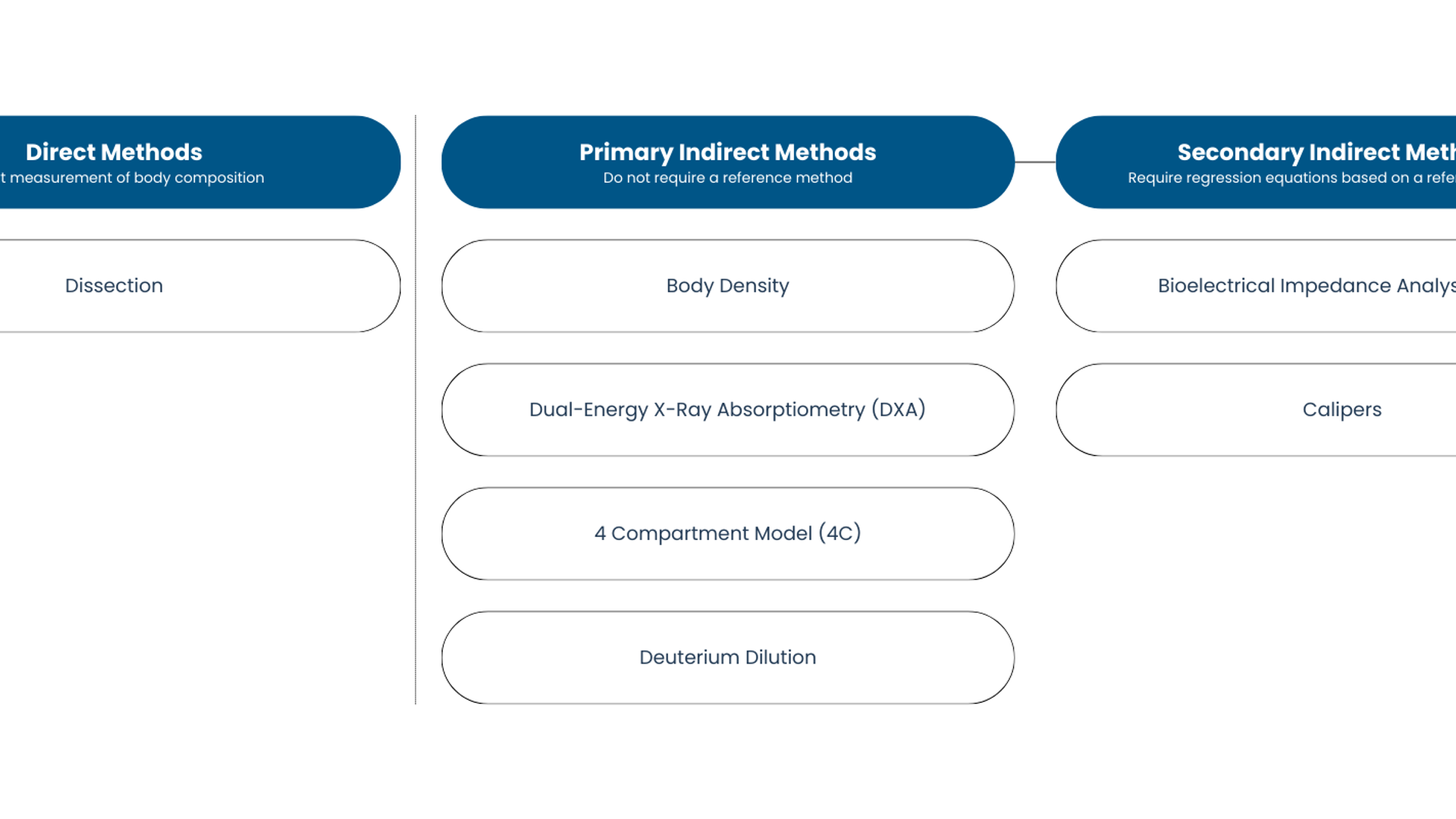 Body composition can be assessed by direct or indirect methods. Direct evaluation requires dissection, and therefore is impractical for living subjects. Consequently, body composition in humans must be estimated by indirect approaches. Indirect methods can be further subdivided into primary indirect methods—derived from theoretical models without reliance on reference equations—and secondary indirect methods, which depend on regression models built from primary techniques.